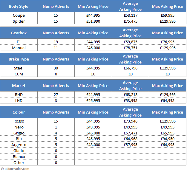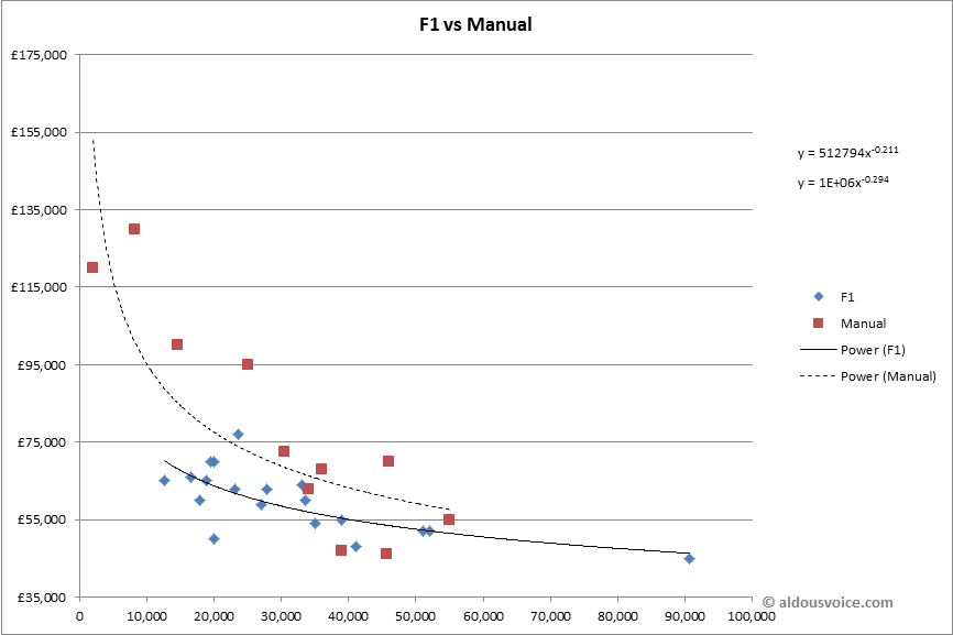 Manual cars are definitely more desirable than those with F1 gearboxes – here’s a breif bit of analysis showing the delta between the two types:
