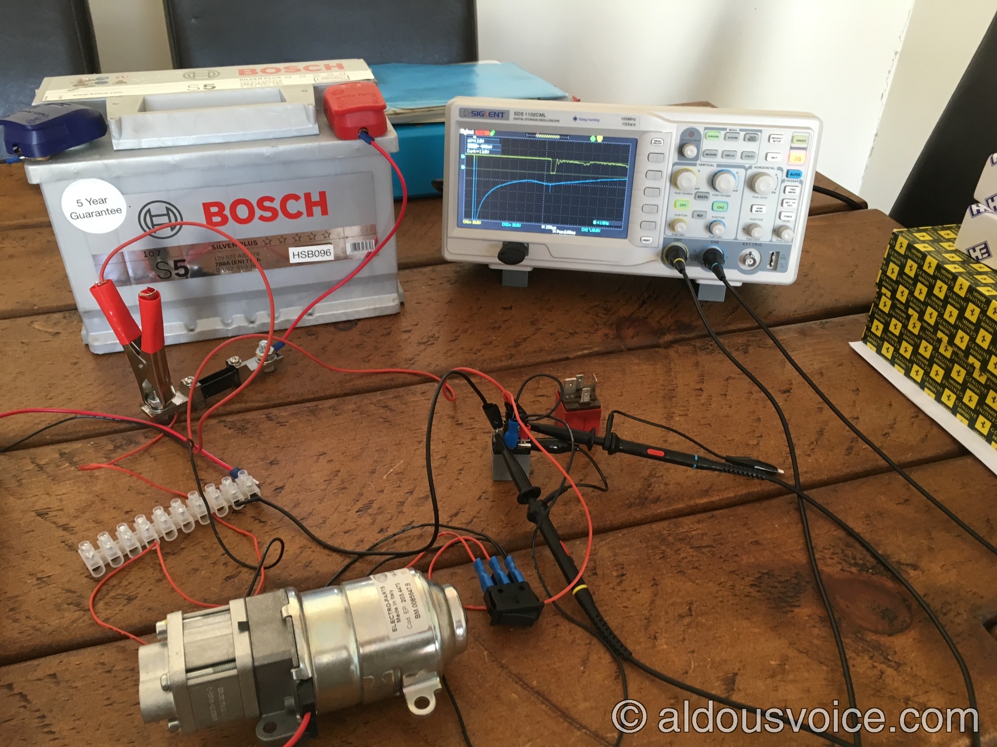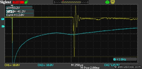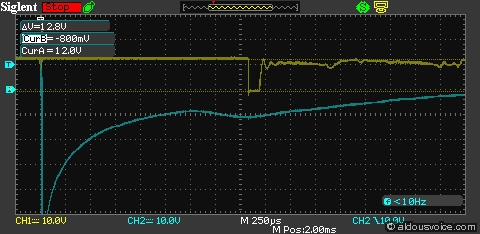 We can test how this works in practice by hooking up the relay to a battery and an F1 pump, and observing the result on a digital storage oscilloscope. In all the following screenshots, channel one (yellow trace) is connected to pin 87, and channel two (blue trace) is connected to pin 85. Triggering is set on the falling edge of channel two, to capture the moment when the relay is instructed to switch the load circuit off.