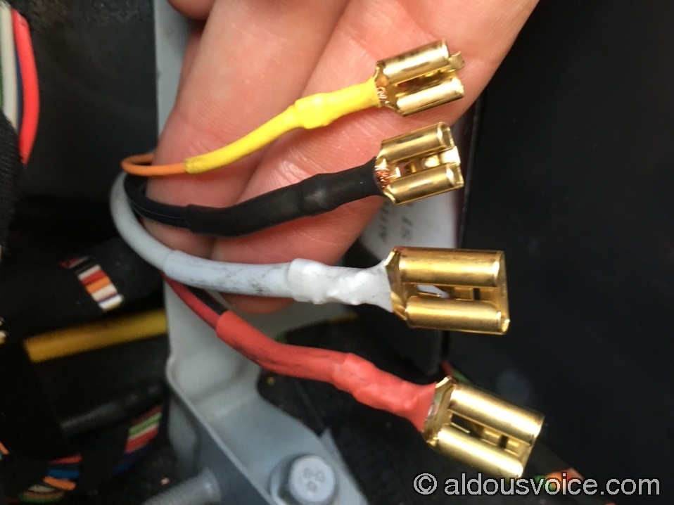 Now that you have enough space to work, it is time for brave pills – the old terminals need to be cut off in order to crimp the new ones onto the wiring loom. The two black wires need to be joined and connected together to the same 6.5mm terminal. The two 9.5mm terminals carry a lot of current so they need to be crimped very securely. I also protected the new connections with some colour-coded heatshrink sleeves.