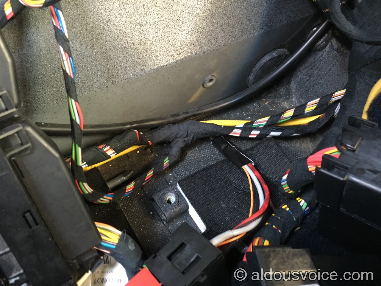 You can now route the wires leading up to the relay base under the front of the panel instead of from the side (left side, as you look at it). I chose to further protect the wires with a small length of duct tape on the section directly underneath the edge of the panel.