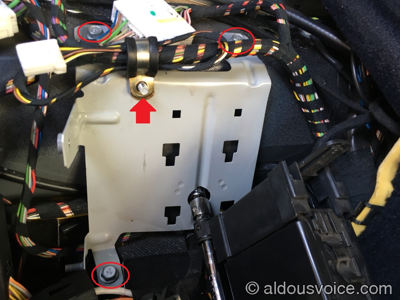 I think it is possible to remove the terminals from the old relay base but I was not able to do so. Also, you will notice that the space available to do any work is very limited – there is almost no slack in the wires. It is still possible to do the relay base conversion like this but with hindsight it is highly recommended that you remove the grey metal panel and re-route the wires, to gain some slack. To do so, you first need to unclip the two black fuse/relay holders from the panel by lifting them up and away. Then, remove the four 10mm hex head screws holding the panel to the chassis, one of which is accessible through a hole in the panel itself. It’s best to also undo the nyloc nut holding a P-clip with a bundle of wires at the top of the panel, as it will it make it possible to completely remove the metal panel.