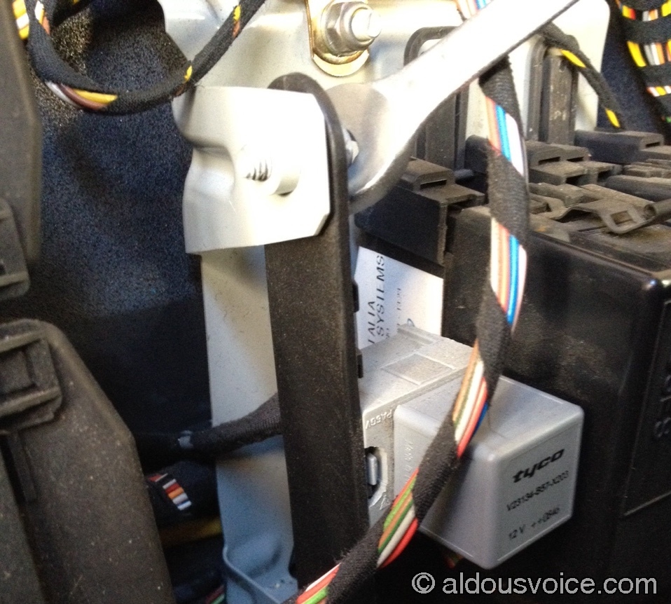 The old relay is located behind the carpet panel behind the driver’s seat (on RHD cars). Its base slots into a plastic mounting bar that is secured to the brackets of a grey metal panel by two 10mm hex head M6 screws.