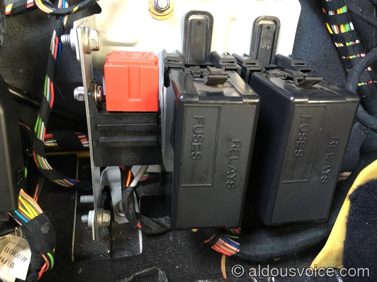 Before proceeding any further, isolate the power using the battery cutoff switch in the boot. Remove the relay base from the mounting bar and the old relay from the base (this may need some force):
