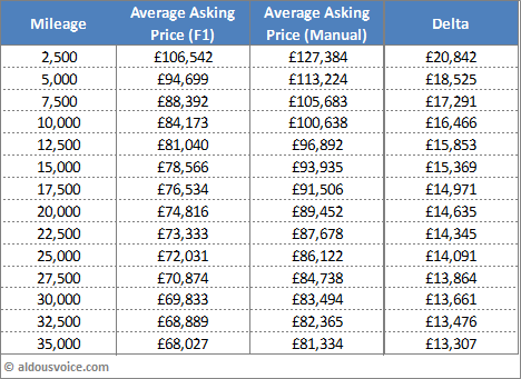 Given the large differential opening up between manual and F1 cars, the above two tables don’t really tell the complete story. I will continue to publish the following tables in order to keep an eye on the delta. Last month the data showed a narrowing however this month the results are much closer to the actual state of the market.