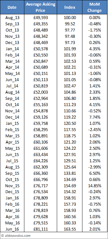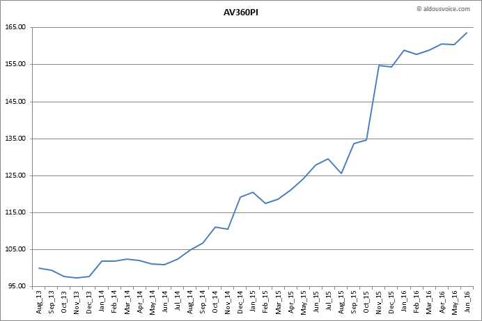 Ferrari 360 prices continue in their gravity defying rise – the average asking price rose another 2% over the last month. That makes nearly 6% up in the first six months of 2016. The price index now stands at 163.55.