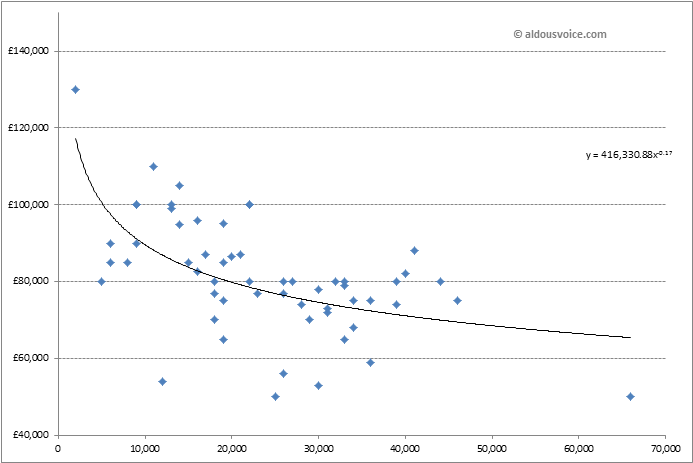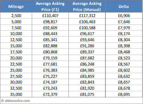 There does appear to be a greater number of manual cars being offered for sale, perhaps as owners are looking to cash in their gains. The spread outlined below is not real – I believe that manual cars are priced a lot higher than the table suggests. This is due in part to the, frankly ridiculously, priced F1 car at £130k.