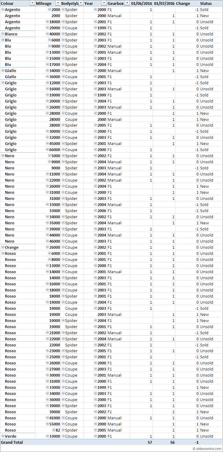 This increase in prices has been solely driven by the, frankly ludicrously priced, spider with 82 miles. Either the price is a typo or the vendor is living in cloud cuckoo land, I just can’t see anyone paying this sort of money for a 360. I should add that I said the same about the Hexagon cars and look what happened to them…