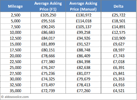 F1 vs Manual. The chart is a little messy due to the £275k outlier…