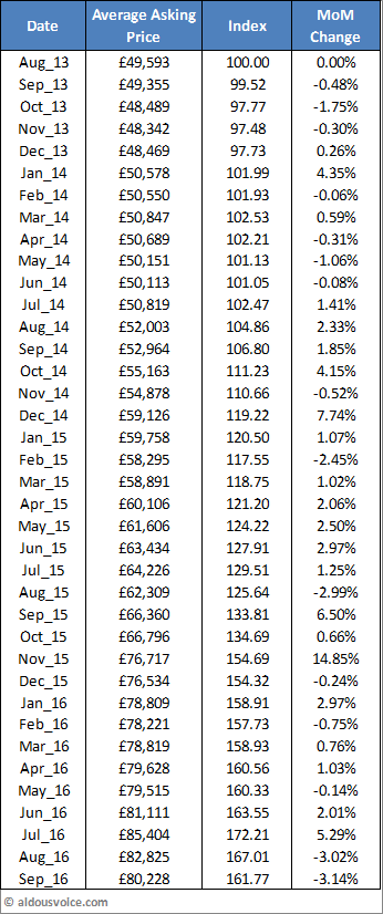 Here’s the main data table. Interestingly, this is the first time since my records began that there isn’t a 360 for sale under £55k. It seems that the price range is under pressure from both ends of the market.