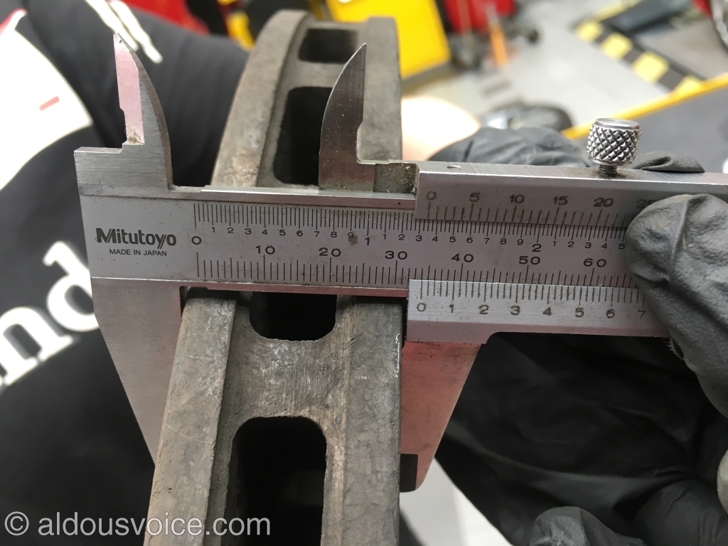 Another issue is that measuring the wear of these discs is problematic. A steel disc loses material evenly from both faces of the disc so determining if the disc is worn is a simple matter of measuring the thickness and comparing it to the manufacturers stated minimum. CCM discs do carry a minimum thickness – 33.5mm in the case below: