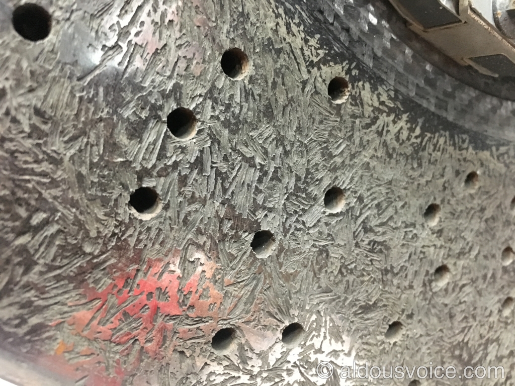 This is because CCM brake discs wear in a much different way. The wear manifests itself as chunks of material falling out of the surface of the disc. The overall thickness remains unchanged but the disc has lost material from the face, thus braking surface is reduced.