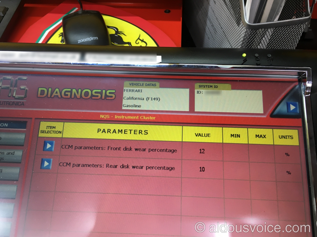 The instrument cluster of the car carries an estimation of brake disc wear based on the number and intensity of brake applications. The car whose brakes are pictured (a California) was showing brake wear of 12% at the front and 10% at the rear. Now I should point out that although the wear rate is an estimation it isn’t that far off that it would suggest such low wear rates for discs beyond their useable life. In this case I suspect that the wear rate had been unscrupulously reset as some point during the past.