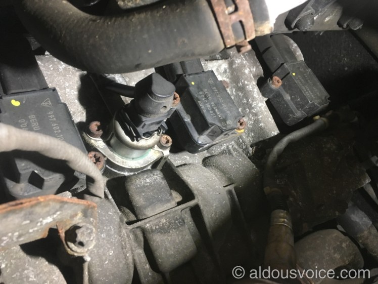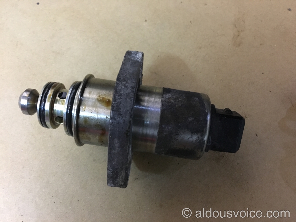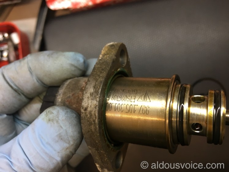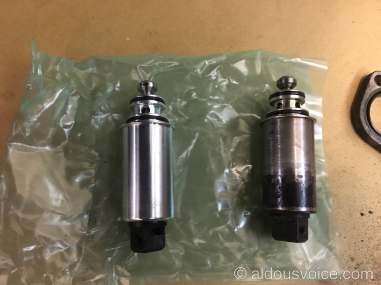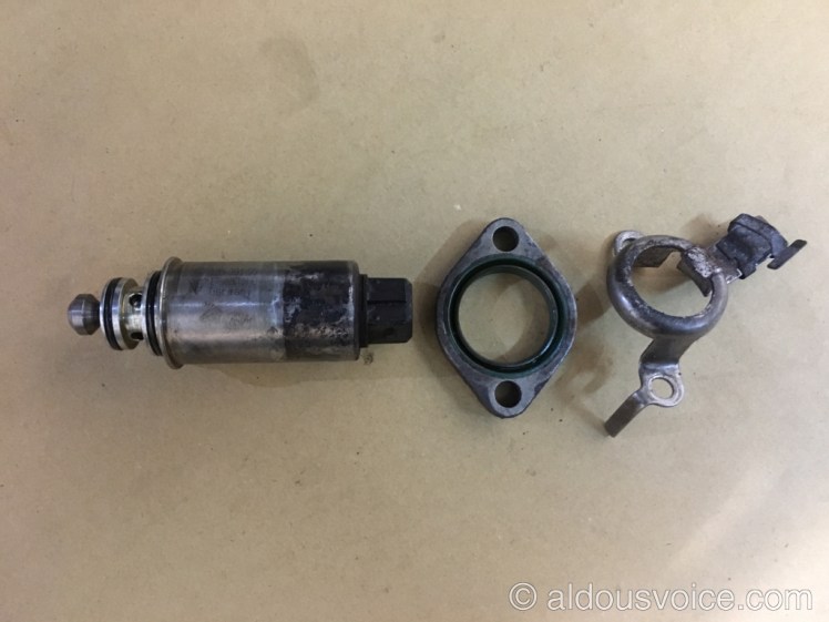 Assuming that the bracket is undamaged, the next step is to check the solenoid itself. It is removed by unscrewing the two bolts (5mm hex) and gently twisting and pulling it out (after disconnecting the cable of course). Have a rag ready to catch the small amount of oil that will dribble out.