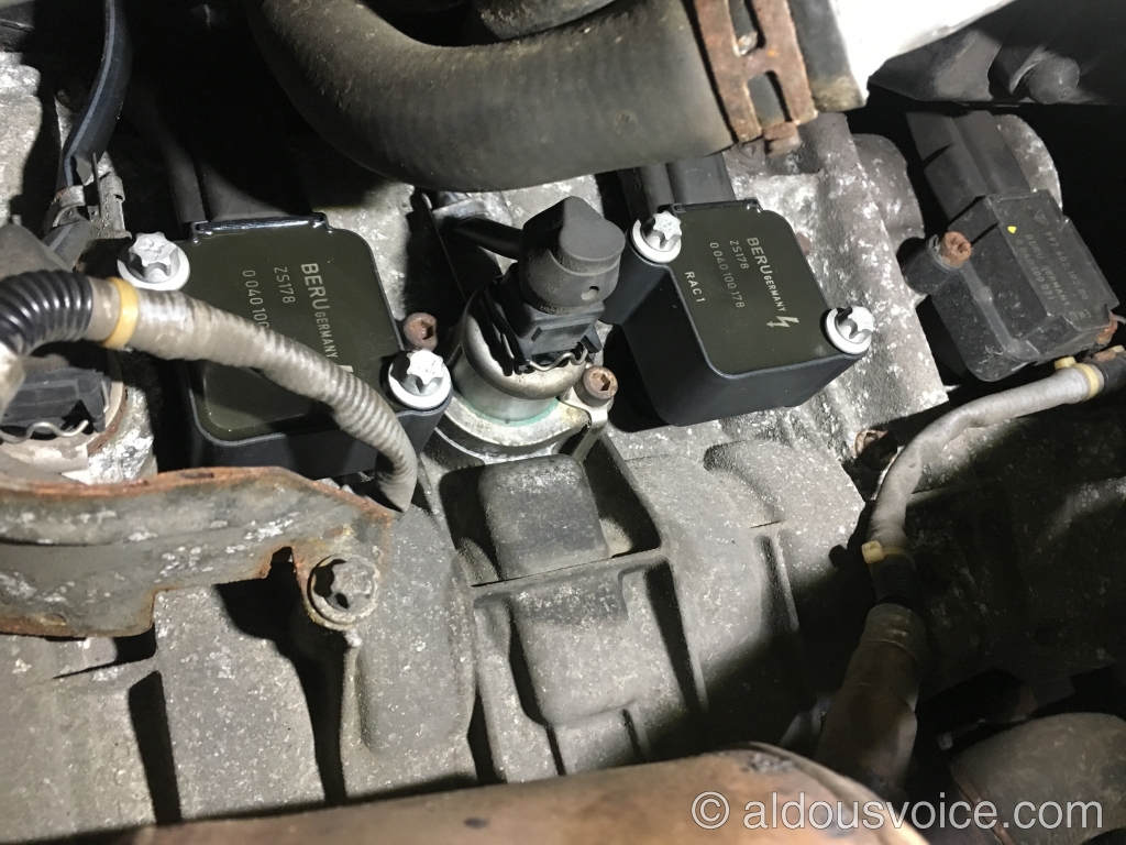 The first thing to do is to gain access to the valve cover by removing the wheel and arch liners. The Variocam solenoid is fitted through the valve cover between coil packs 2 & 3 on bank 1 and 5 & 6 on bank 2. It can be seen here between the two new coil packs.
