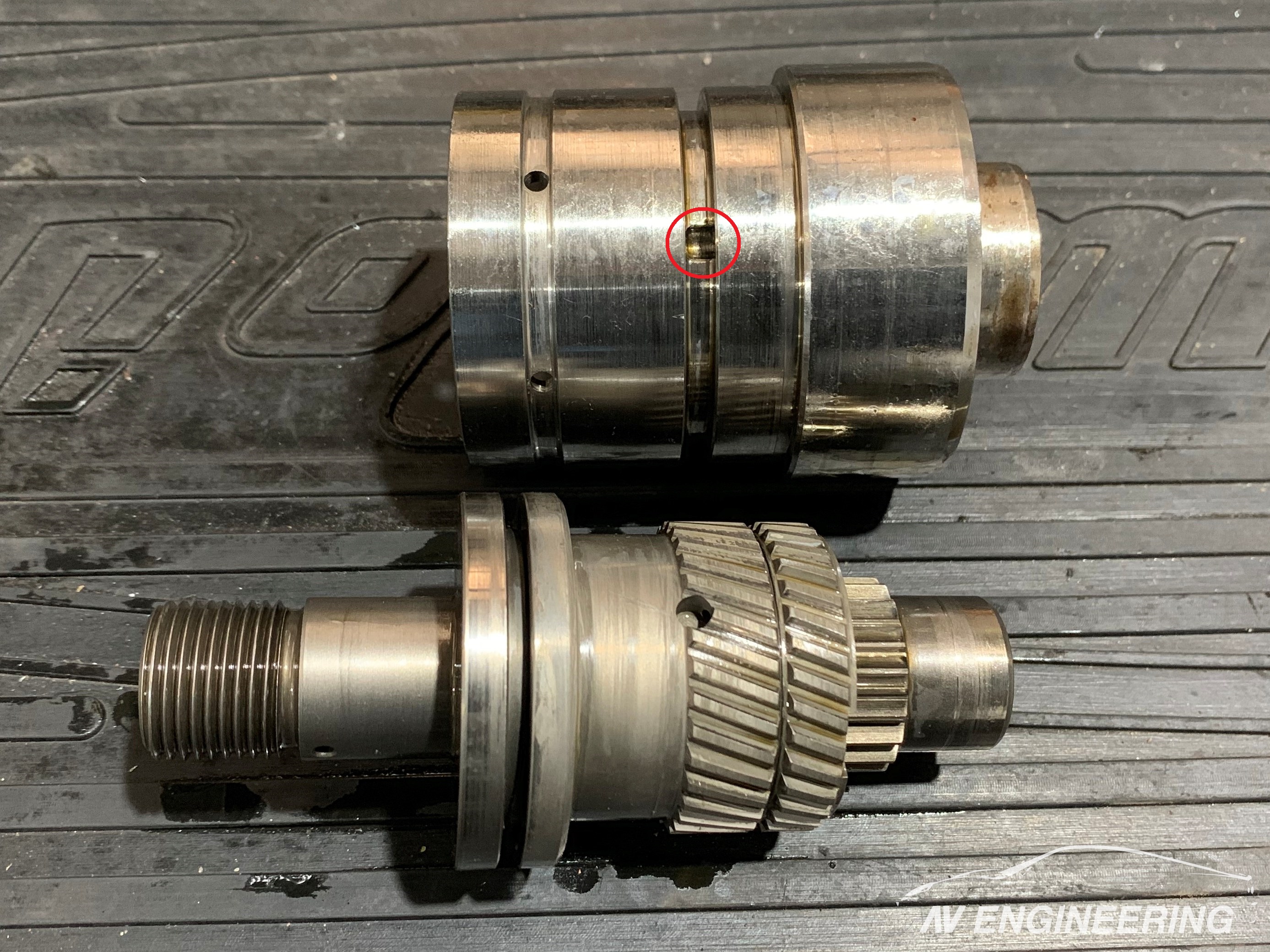 When the Motronic decides to activate the variator, oil is allowed to flow into the hole marked red and fills the cylinder of the body with oil under high pressure. This acts against the flange of the larger gear and moves both gears backwards along the shaft (to the left in the picture). The helical gears then turn the body of the variator in relation to the shaft, thus altering the timing.